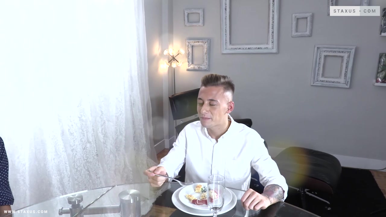 Chris Jansen and David Sky are a couple of well-heeled buddies with a taste for the good life – which explains why they’ve got a gorgeous butler to help assist them at meal-times, in the form of the ever-delicious Mike Cole What’s more, their good fortune isn’t just limited to having cash in the bank; for it turns out that their handsome assistant doesn’t just limit his domestic duties to serving meals In fact, Cole is clearly more than happy to go the extra mile to keep his superiors happy – even to the point of getting down on his knees at the table so that he can give both guys a much-needed oral workout on their cocks Let’s be honest, you really couldn’t put a price on this kind of employee involvement; and it should perhaps come as little surprise to anyone that Jansen and Sky are soon replicating the involvement by simultaneously slurping on Cole’s now very swollen appendage No doubt about it, these are three very horny boys; and the temperature in the room only notches up even further when Cole abandons all dignity by getting down on all fours so that he can rim Jansen’s arsehole whilst Sky bangs him from behind At which point you’d be quite forgiven for thinking that it’s Cole who’s going to be the centrepiece of the action In many respects, however, this little red-herring is but a prelude to the real zenith of this kinky threesome; when Jansen promptly surrenders his hungry little pucker to his two co-stars simultaneously, resulting in Sky creaming his hole and Cole splattering his generous wad of pent-up boy-goo all over the other two lads’ expectant lips! – Chris Jansen, David Sky, Mike Cole