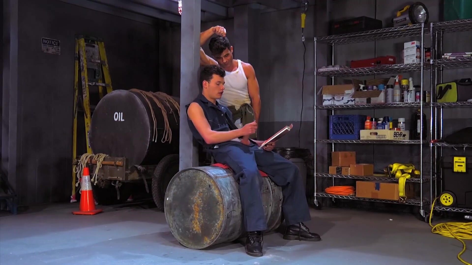 (Models Lance Hart, Micky Mackenzie) Sitting on a steel barrel, mechanic’s apprentice Micky Mackenzie jerks his cock while gazing at a gay porn mag Behind him, lead mechanic Lance Hart is unimpressed If Micky wants to keep his job, he’ll have to give Lance what he wants Micky stands up straight and Lance binds him to a post with thick, rough hemp rope Lance attaches Micky’s hands to his cock and starts intensely tickling the young apprentice Lance even strips off Micky’s socks and attacks his feet No matter how much Micky struggles, he can’t get away from Lance’s tickling fingers After completing his relentless ticklation, Lance straps a gag over Micky’s face with a big, black dildo protruding from it He pushes Micky down on the pole so that he is crouching on the floor Shedding his work jumpsuit, Lance backs his ass up into Micky’s face and fucks himself on the dildo strapped to Micky’s mouth When Lance has satisfied his ass, he unties Micky, lays him on top of a barrel, and shoves his cock inside the sub’s tight hole Micky squeezes his eyes shut and contorts his face as Lance has his way with Micky’s ass