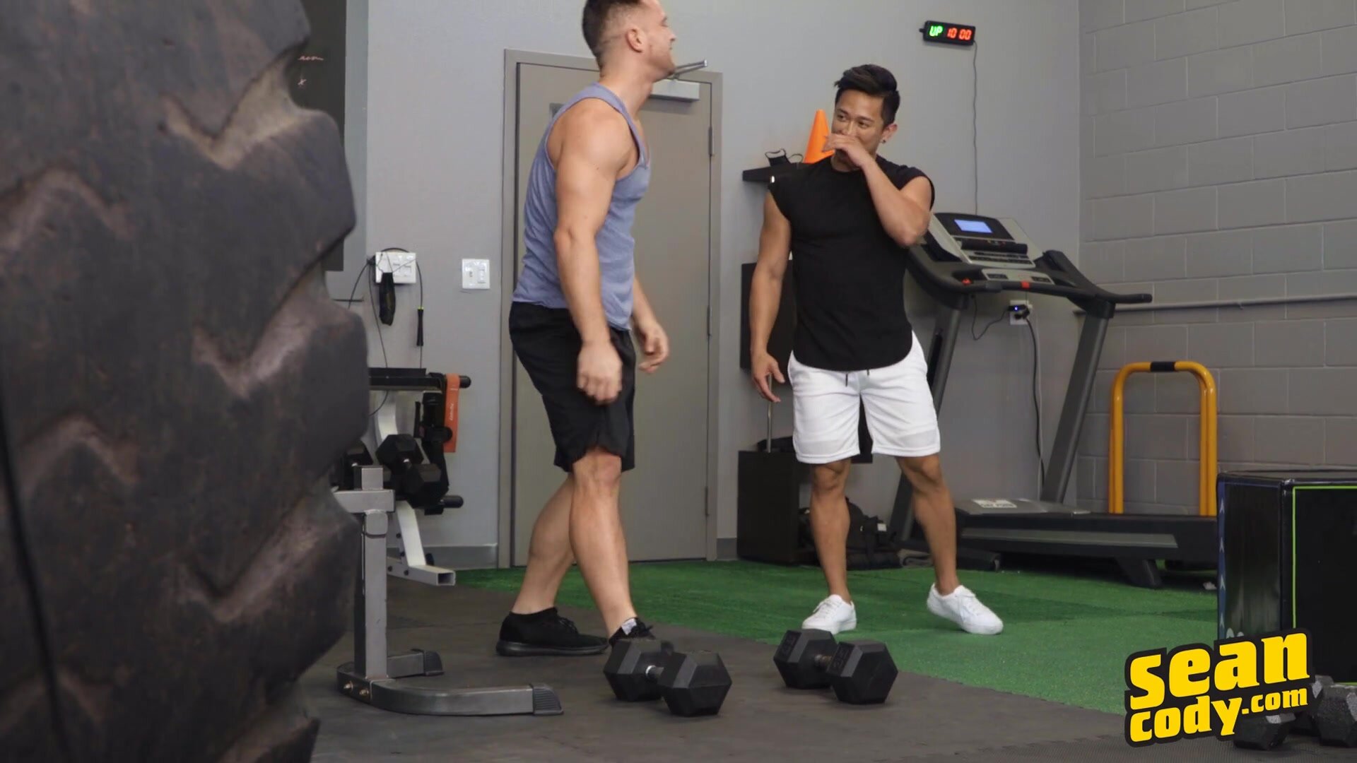 Deacon says "This is giving me good motivation" as he and Dale take turns spotting each other in the gym, doing some pushups and pullups As Deacon bench presses, he sucks Dale’s hard pole Dale fucks the top’s mouth and then bends over the bench for Deacon to rim his hole before he sucks Deacon’s big cock "Oh fuck me," the raven-haired bottom moans as Deacon’s tongue penetrates his ass once more, then he gets his wish as Deacon fucks him doggystyle He rides that dick until Deacon picks him up and puts him on his back on a block, before the guys move to the swing where Dale cums hard The top rewards him with a nice, long creampie